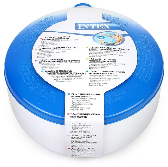 | Дополнительная информация | вмещает 7,6 см таблетки хлора, брома; изготовлен из стойкого к ультрафиолетовому излучению пластика; диаметр поплавка 17,8 см |